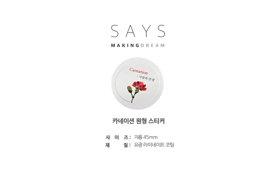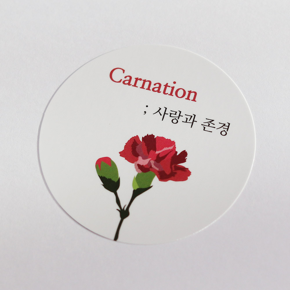 카네이션 일러스트가 그려진 원형 유광 스티커입니다.
