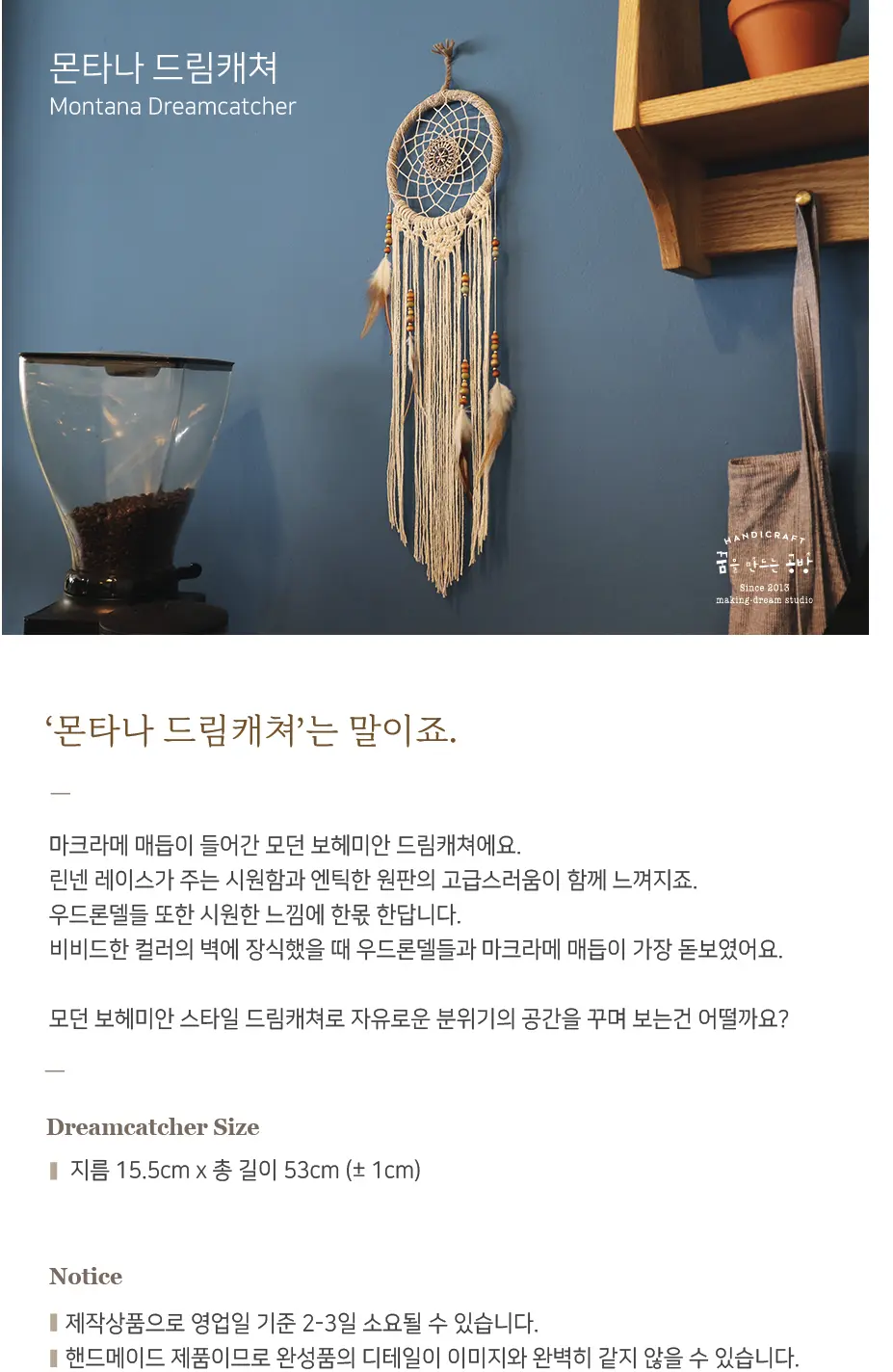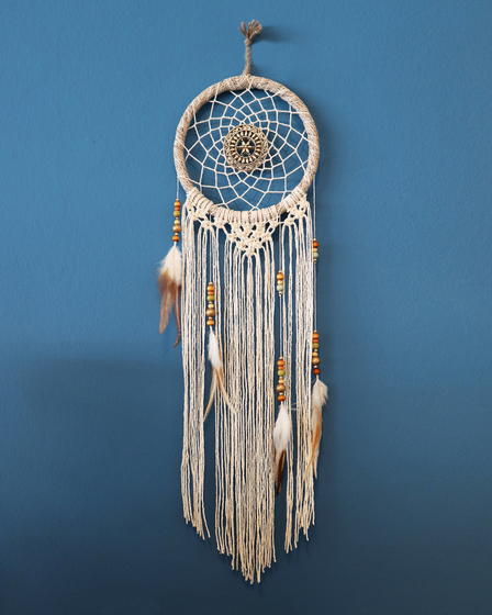 모던 보헤미안 스타일의 마크라메 드림캐쳐입니다. 비비드한 컬러의 벽에 잘 어울려요 :)