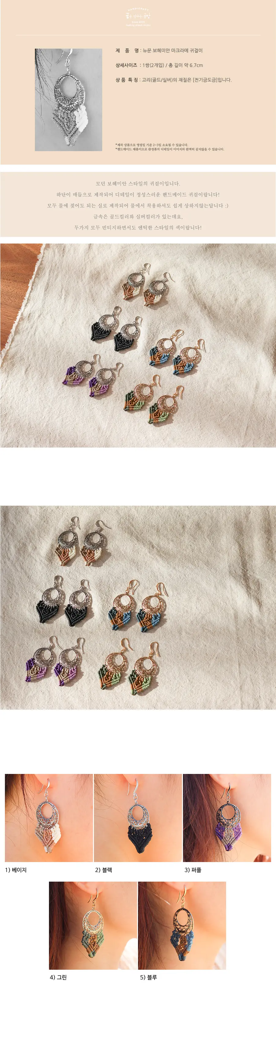 베이지/블랙/퍼플/그린/블루 5가지 자유로운 보헤미안 스타일의 귀걸이입니다 :)