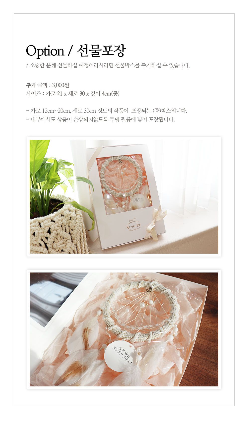 지름 13~19cm이하의 인테리어용 드림캐쳐를 구매하신 분들께서 함께 구매하실 수 있는 선물포장입니다.