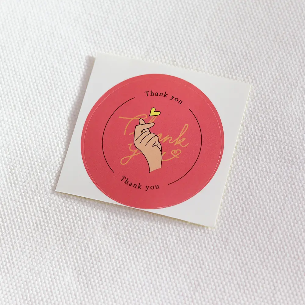 귀여운 손하트 일러스트가 그려진 감사 원형 유광 스티커입니다.