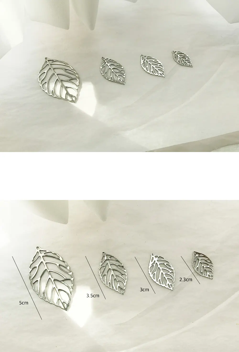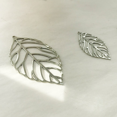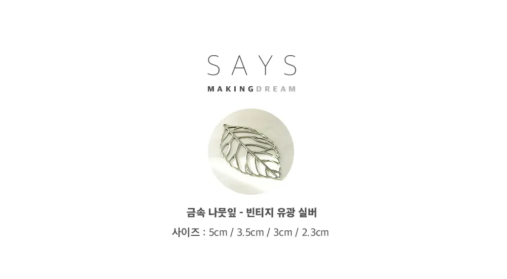 5cm / 3.5cm / 3cm / 2.3cm 총 4가지 사이즈의 유광 실버 금속나뭇잎입니다.