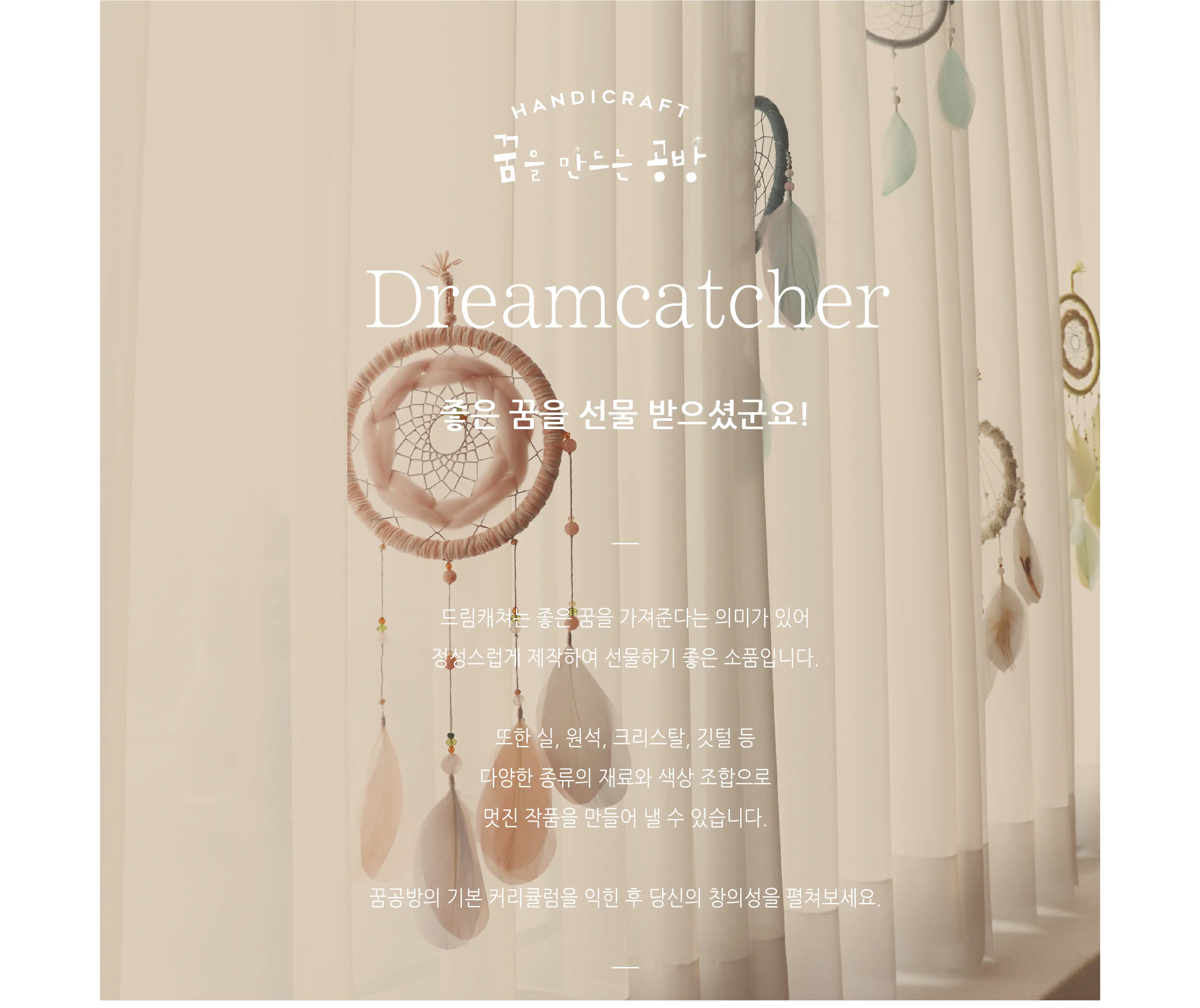 꿈을만드는공방 협회의 드림캐쳐 민간자격증 과정입니다. 총 10개의 드림캐쳐 작품을 제작하실 수 있습니다. 자격증비(협회비) 8만원은 별도입니다.