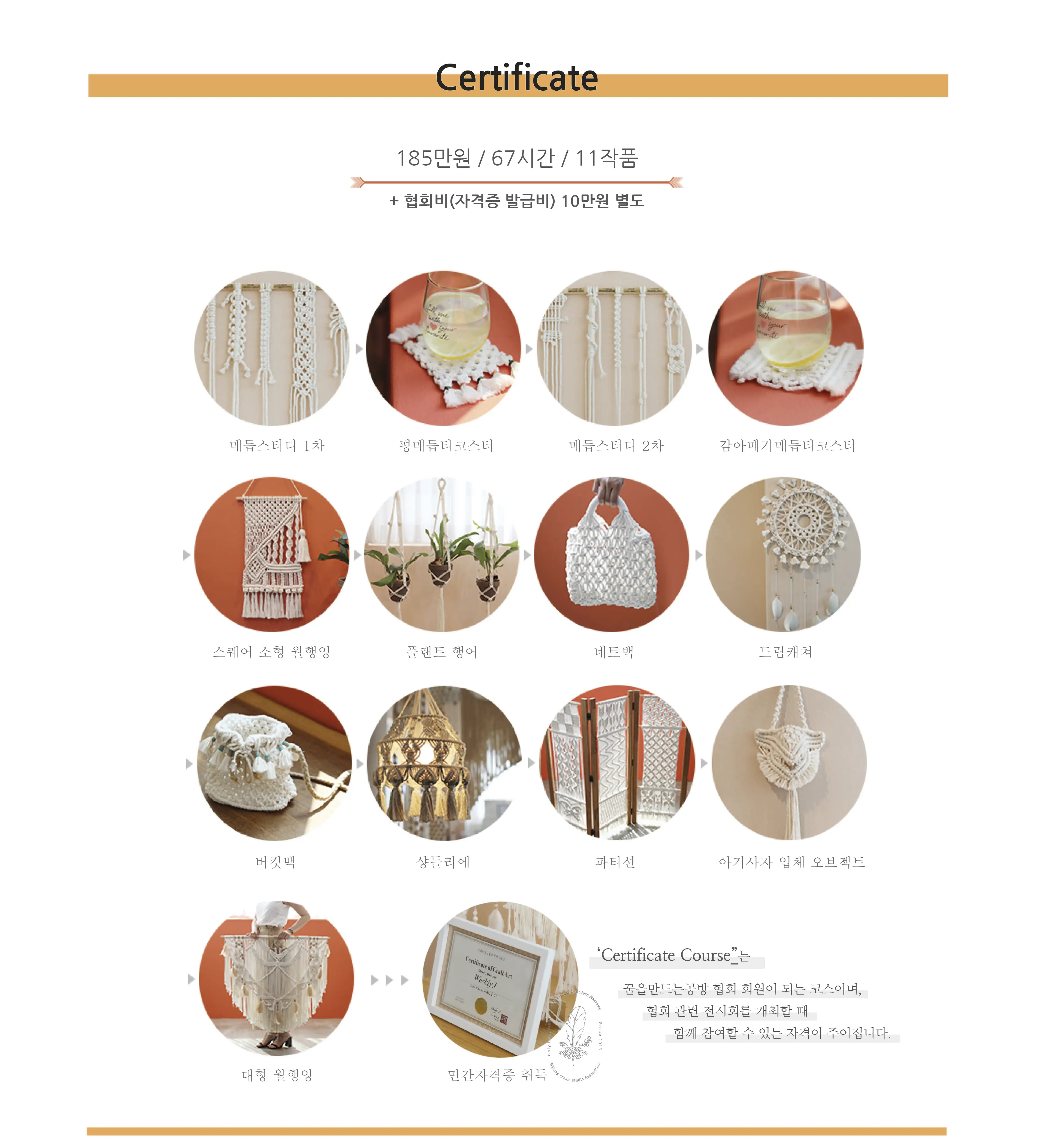 꿈을만드는공방 협회의 드림캐쳐 민간자격증 과정입니다. 총 10개의 드림캐쳐 작품을 제작하실 수 있습니다. 자격증비(협회비) 8만원은 별도입니다.
