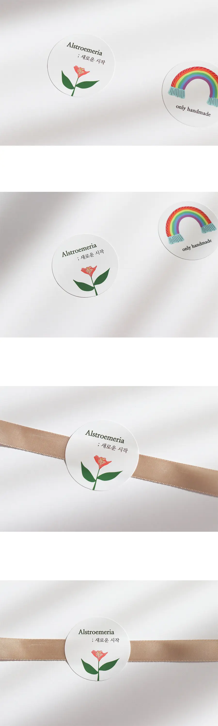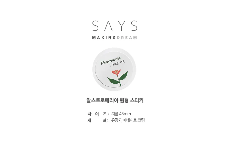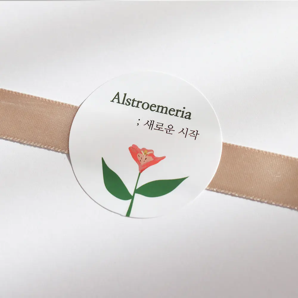 '새로운 시작'이라는 꽃말을 가진 알스트로메리아 일러스트가 그려져 있는 원형 스티커입니다 :)