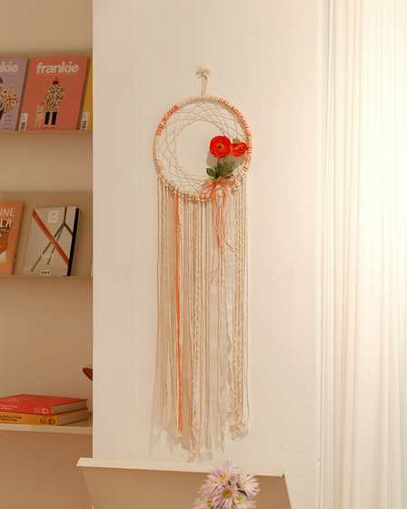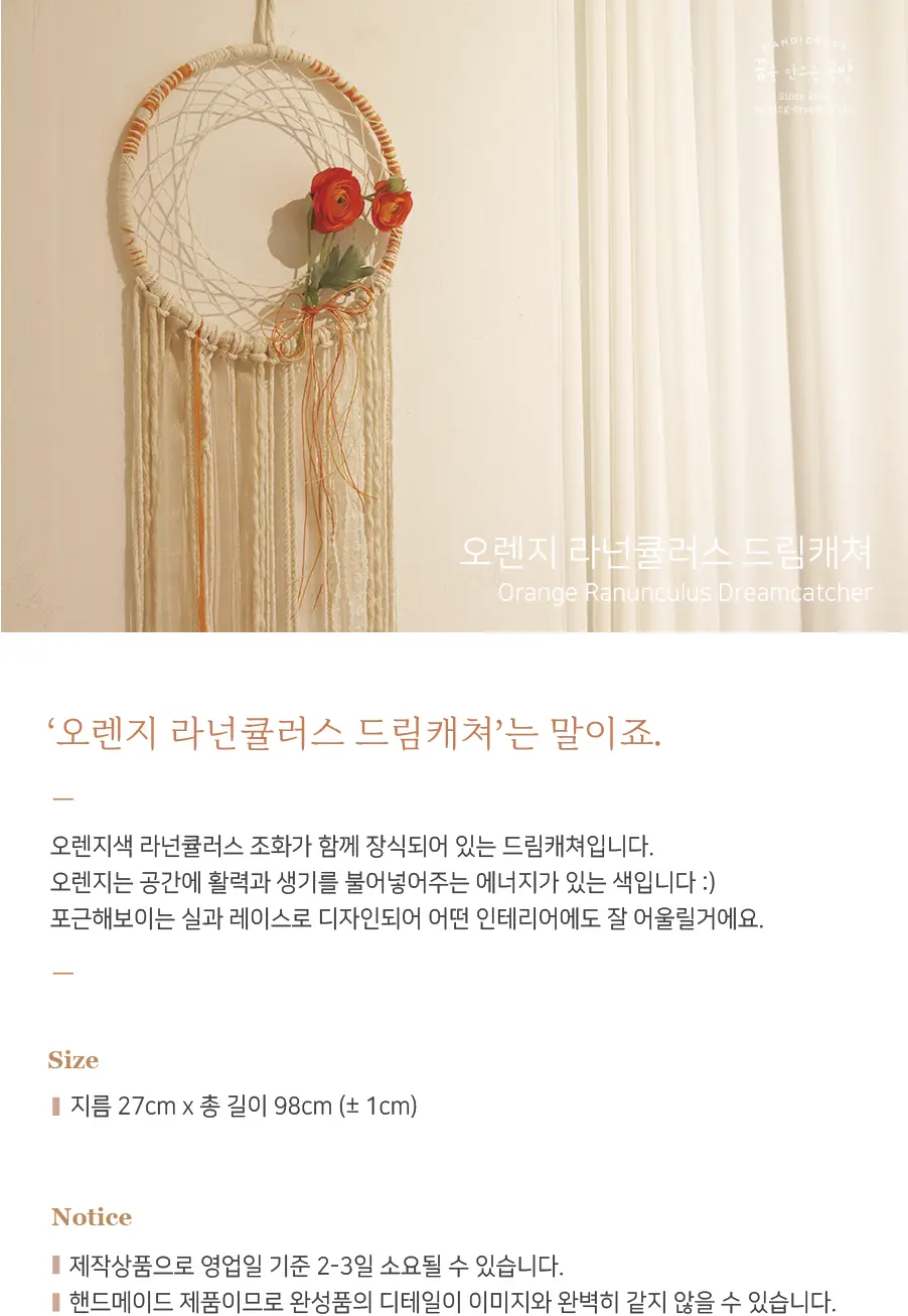 오렌지색의 경쾌하면서도 따뜻한 색감의 조화 드림캐쳐입니다.