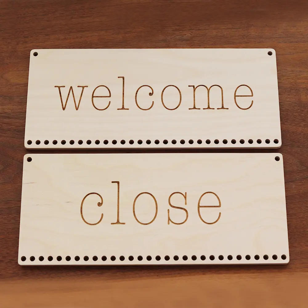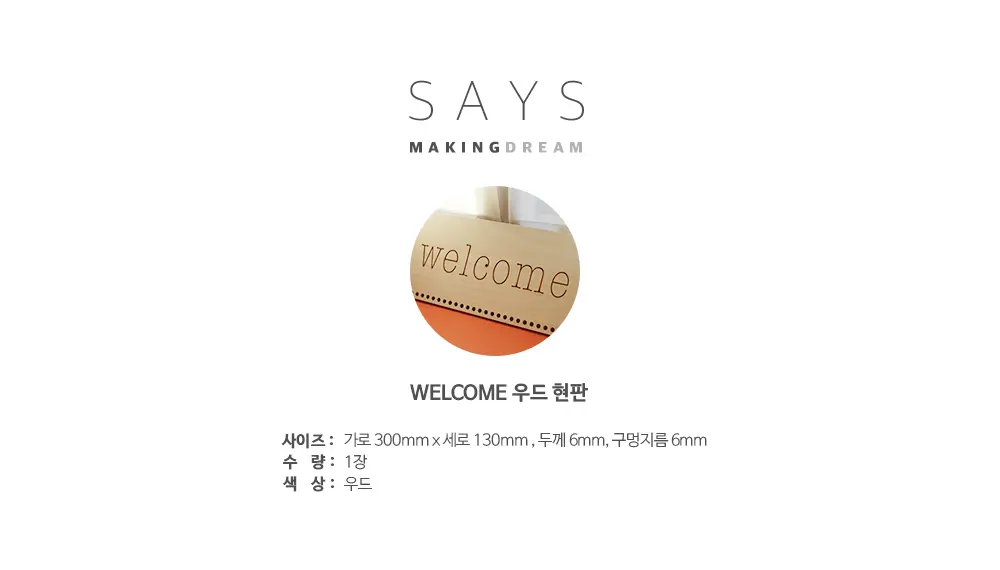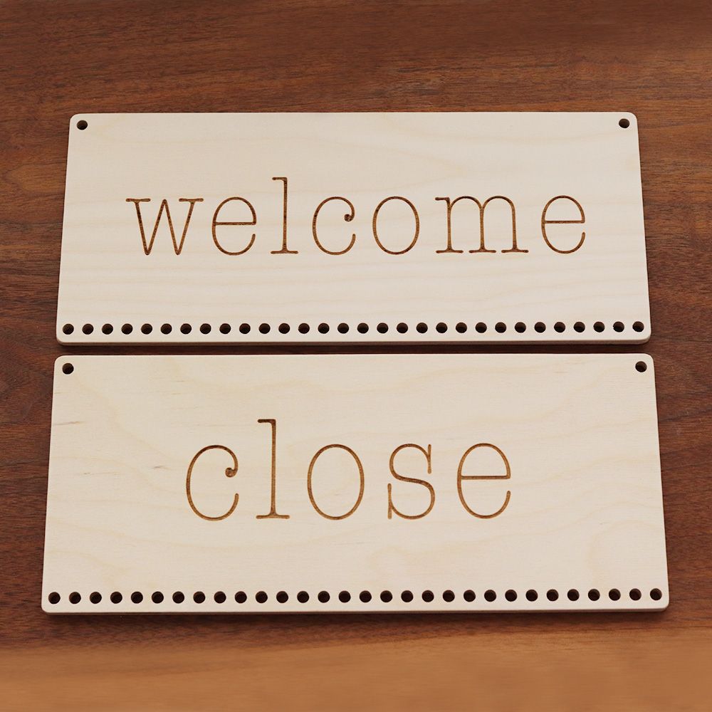 300x130mm 앞 WELCOME / 뒤 CLOSE 사인이 각인되어있으며 하단에 줄을 걸 수 있도록 타공이 30개가 있는 우드 현판입니다.