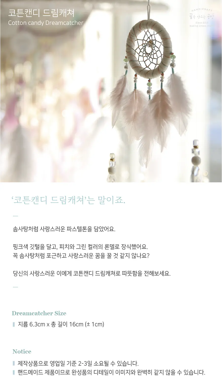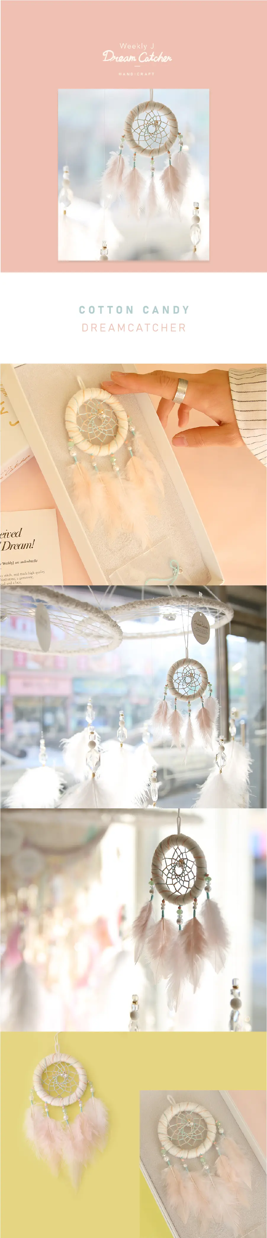 솜사탕처럼 포근한 컬러의 코튼캔디 드림캐쳐입니다. 차량용으로 장식하기에 좋은 미니미한 사이즈에요!