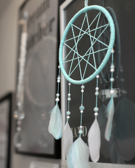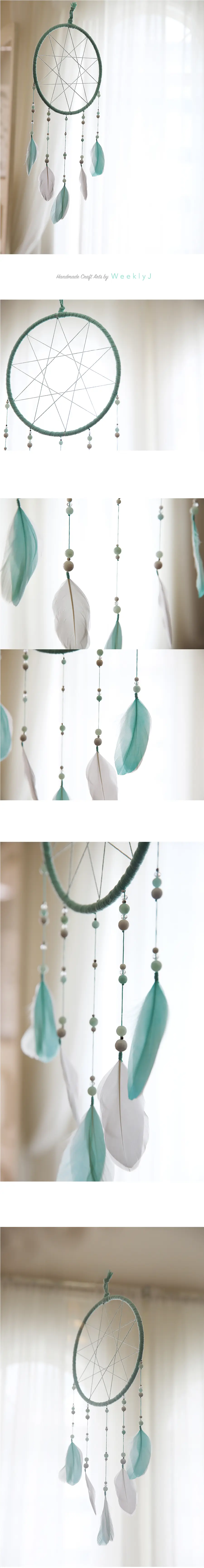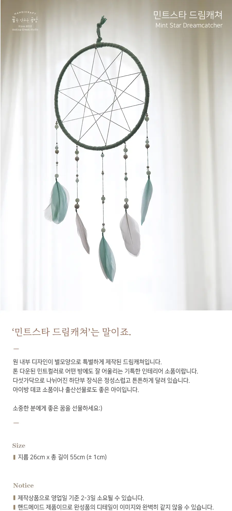 별 모양으로 디자인된 민트컬러의 드림캐쳐입니다! 아기방 데코에 좋은 아이템이에요 :)